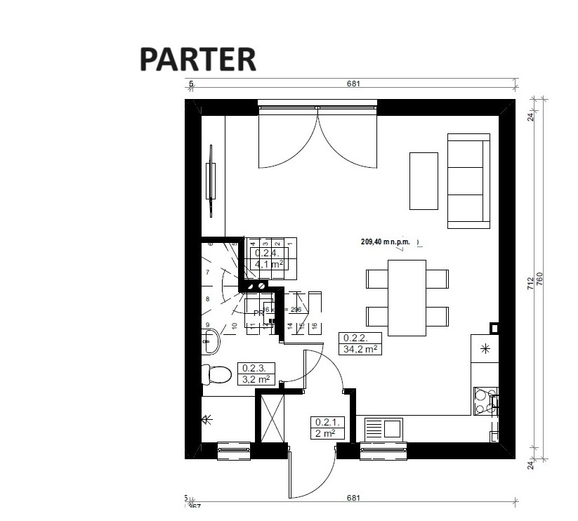- przestronna salon z kuchnią o pow. ok. 34m2