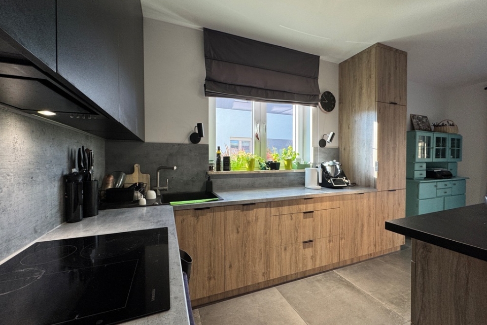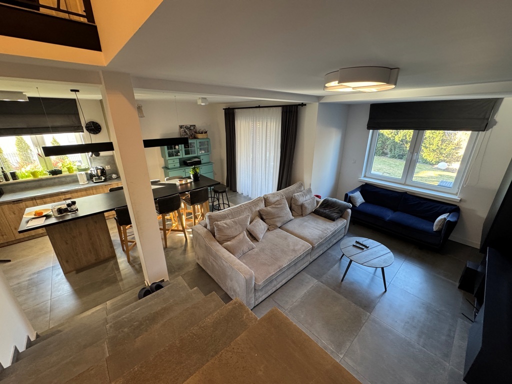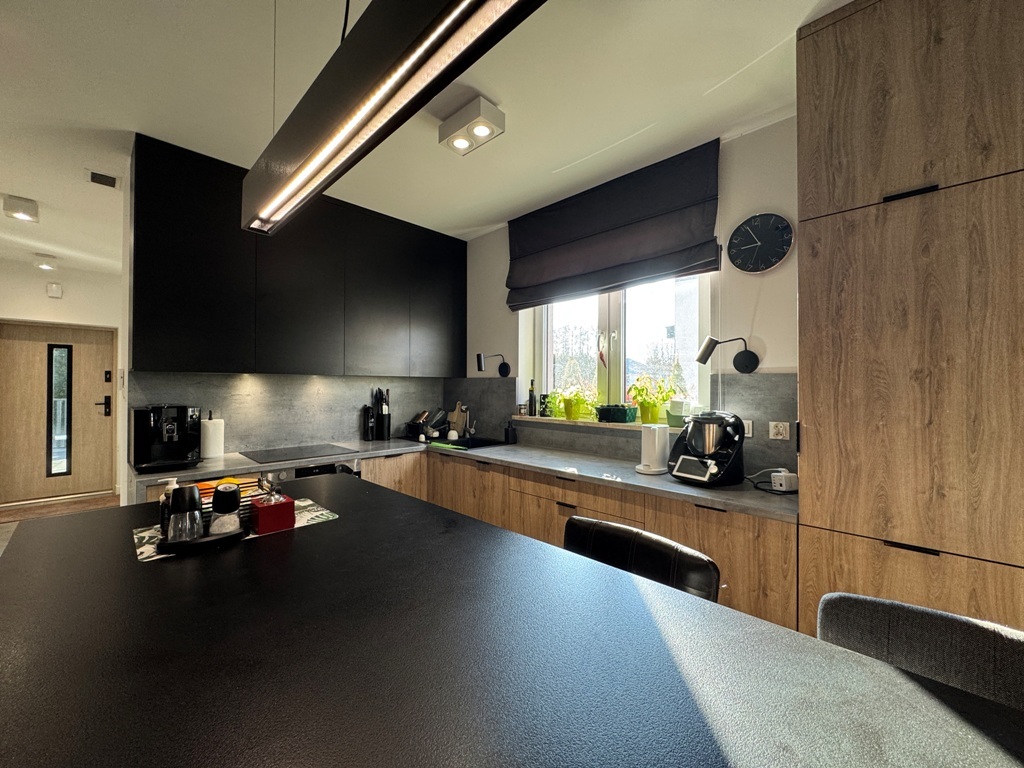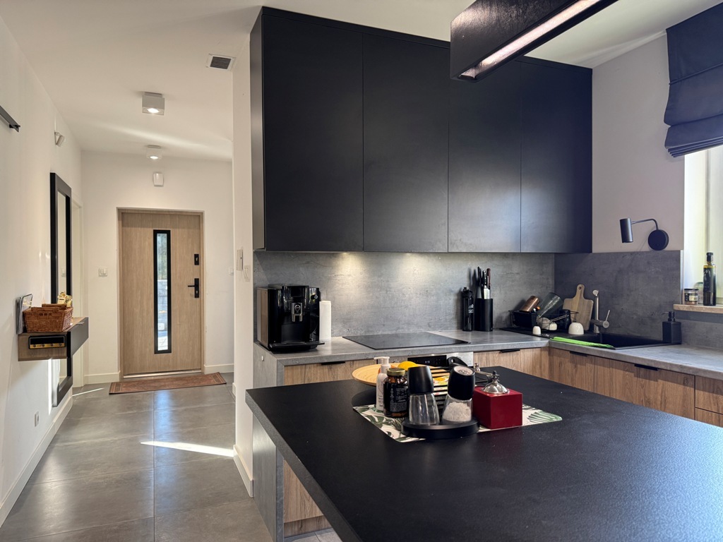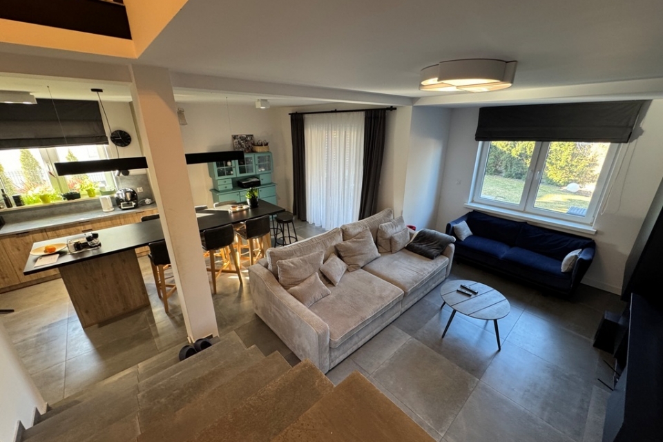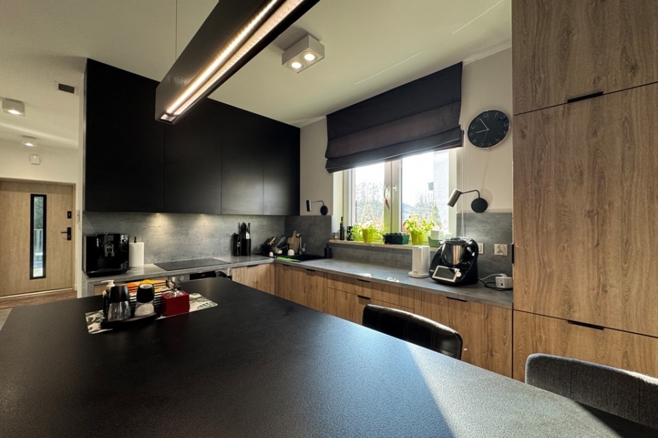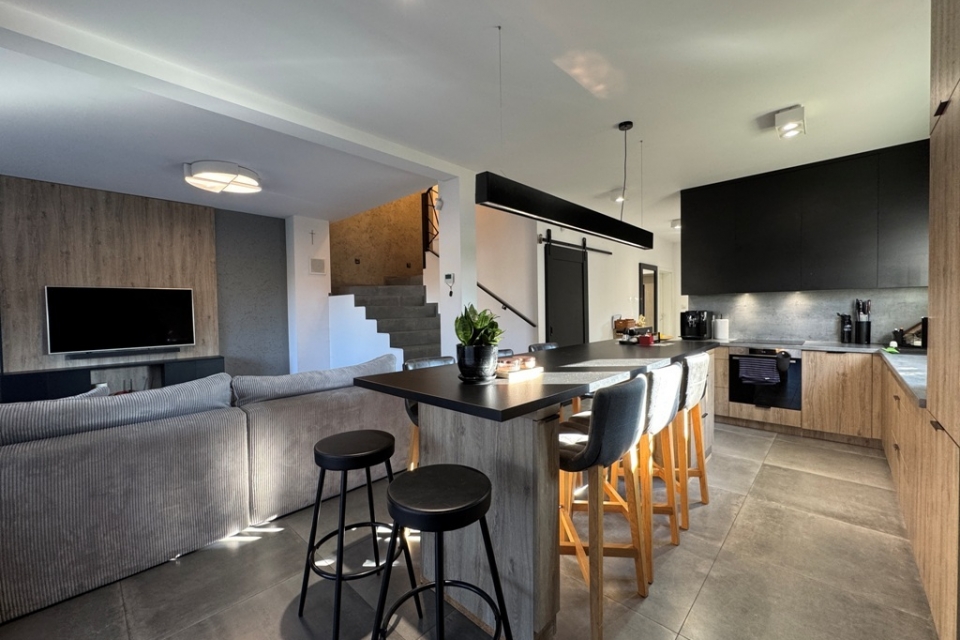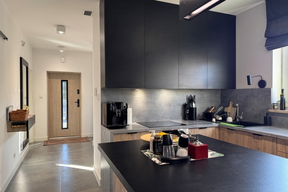 Z zewnątrz bryła domu prezentuje się czysto i spokojnie ale po przekroczeniu progu wita Cię niepowtarzalny styl oraz otwarta, płynna przestrzeń dzienna. Salon i kuchnia to jedno serce domu: salon z dwiema wygodnymi sofami i stolikiem kawowym oraz ściana medialna, kuchnia i jej długa wyspa pełniąca rolę stołu, idealnego na przyjęcia w gronie przyjaciół, matowe czarne fronty dodające charakteru, ciepłe światło stwarza przytulny klimat i widok na taras, gdzie letnie wieczory w otoczeniu ogrodu spędzisz w atmosferze relaksu.