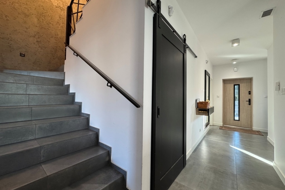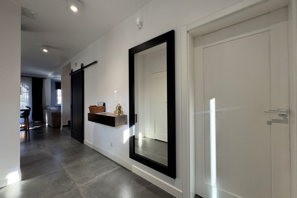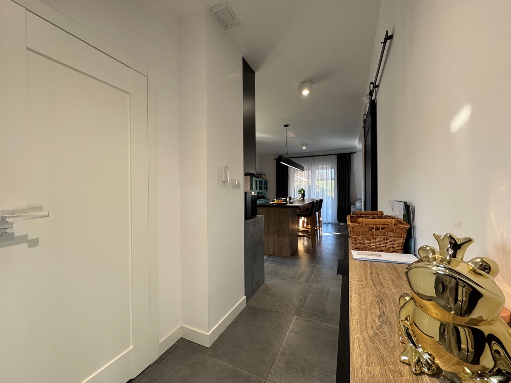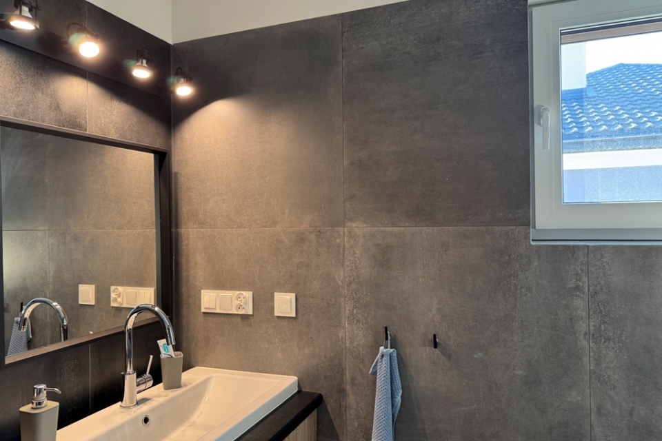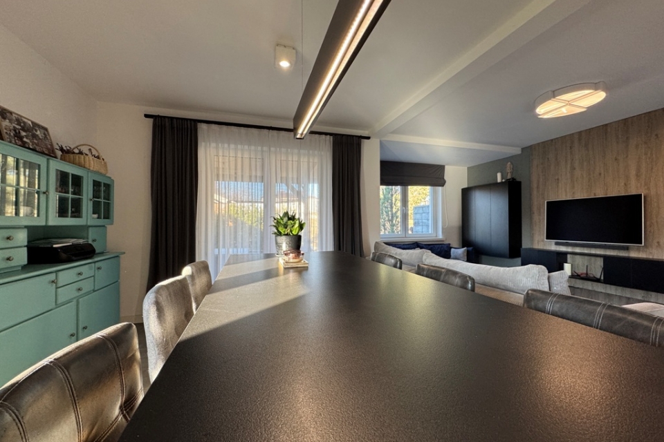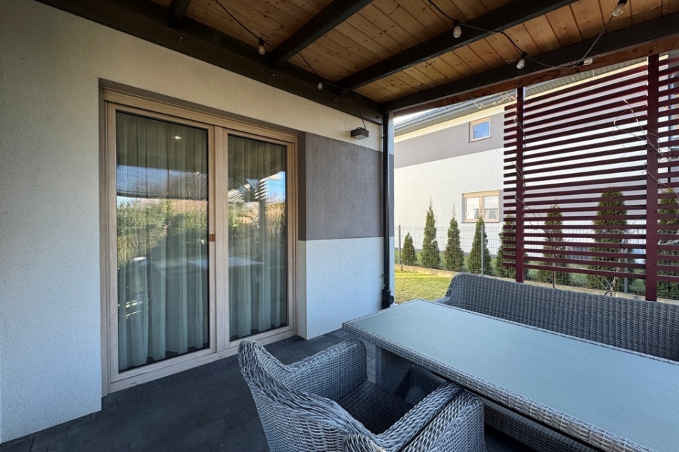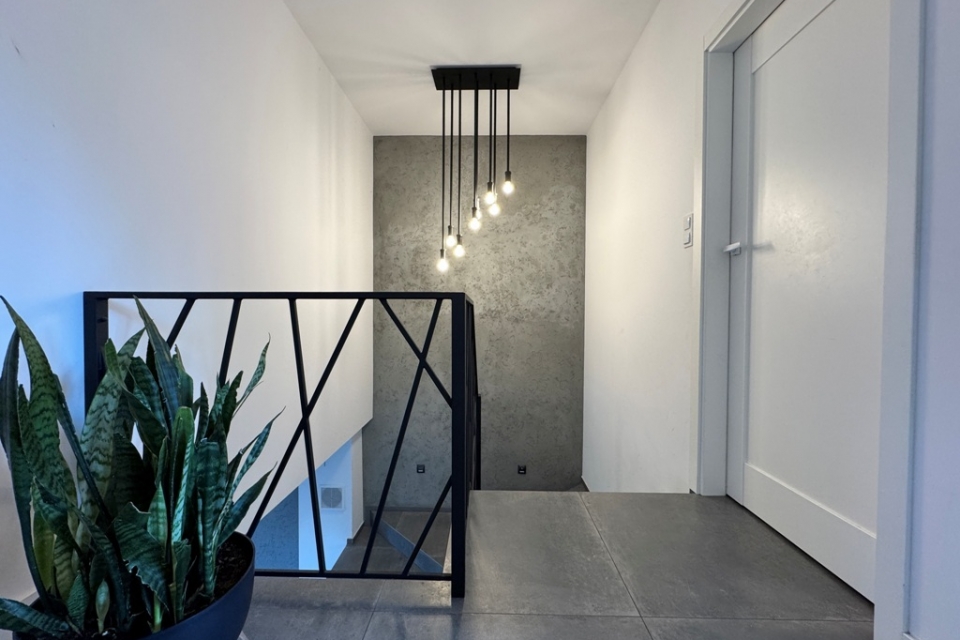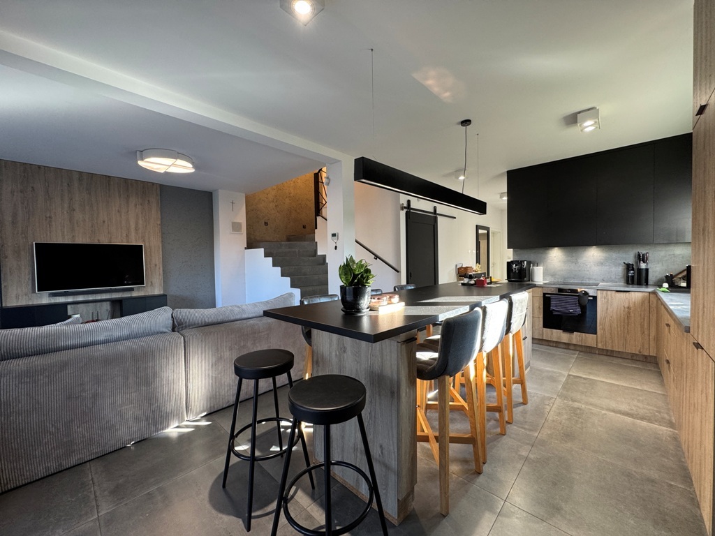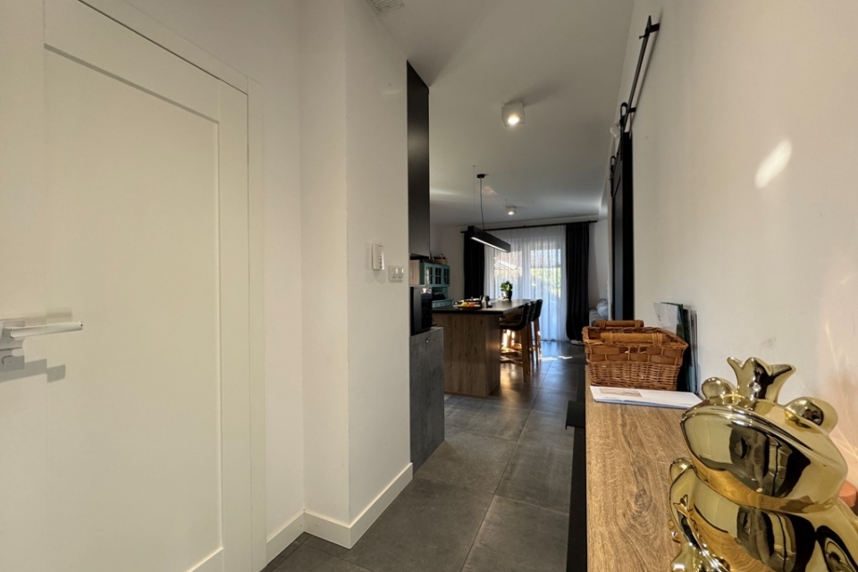 Z zewnątrz bryła domu prezentuje się czysto i spokojnie ale po przekroczeniu progu wita Cię niepowtarzalny styl oraz otwarta, płynna przestrzeń dzienna. Salon i kuchnia to jedno serce domu: salon z dwiema wygodnymi sofami i stolikiem kawowym oraz ściana medialna, kuchnia i jej długa wyspa pełniąca rolę stołu, idealnego na przyjęcia w gronie przyjaciół, matowe czarne fronty dodające charakteru, ciepłe światło stwarza przytulny klimat i widok na taras, gdzie letnie wieczory w otoczeniu ogrodu spędzisz w atmosferze relaksu.
