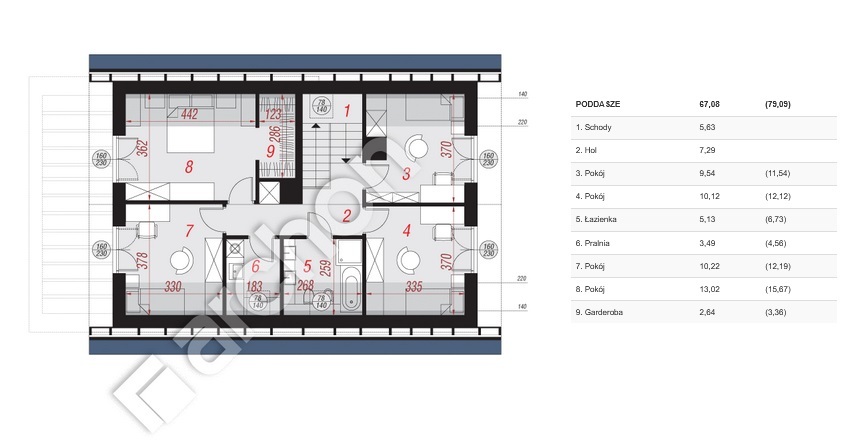 "Dom w szyszkowcach" z poddaszem użytkowym oraz jednostanowiskowym garażem. Strefę wejściową zaakcentowano nowoczesną ramą, która łączy się z ogrodową pergolą. Wspaniale prezentują się przeszklenia, wizualnie dodają bryle lekkości, doświetlają wnętrze. Przestronna strefa dzienna to komfortowe miejsce rodzinnego wypoczynku oraz pracy. Szerokie, przesuwne przeszklenie płynnie łączy wnętrze domu z tarasem, który można zadaszyć. W pobliżu schodów prowadzących na poddasze zaprojektowano toaletę, a przez wiatrołap zapewniono mieszkańcom możliwość szybkiego przejścia do garażu i dalej do kotłowni. Komfortowy wypoczynek prywatny w zaciszu strefy nocnej na poddaszu oferują domownikom cztery doskonale doświetlone, ustawne pokoje. Przy sypialni rodziców przewidziano prywatną garderobę, w pozostałych pokojach szafy ubraniowe. Łazienka mieści wannę, prysznic, a także dwie nablatowe umywalki. Osobna pralnia umożliwi właściwą organizację prac domowych.