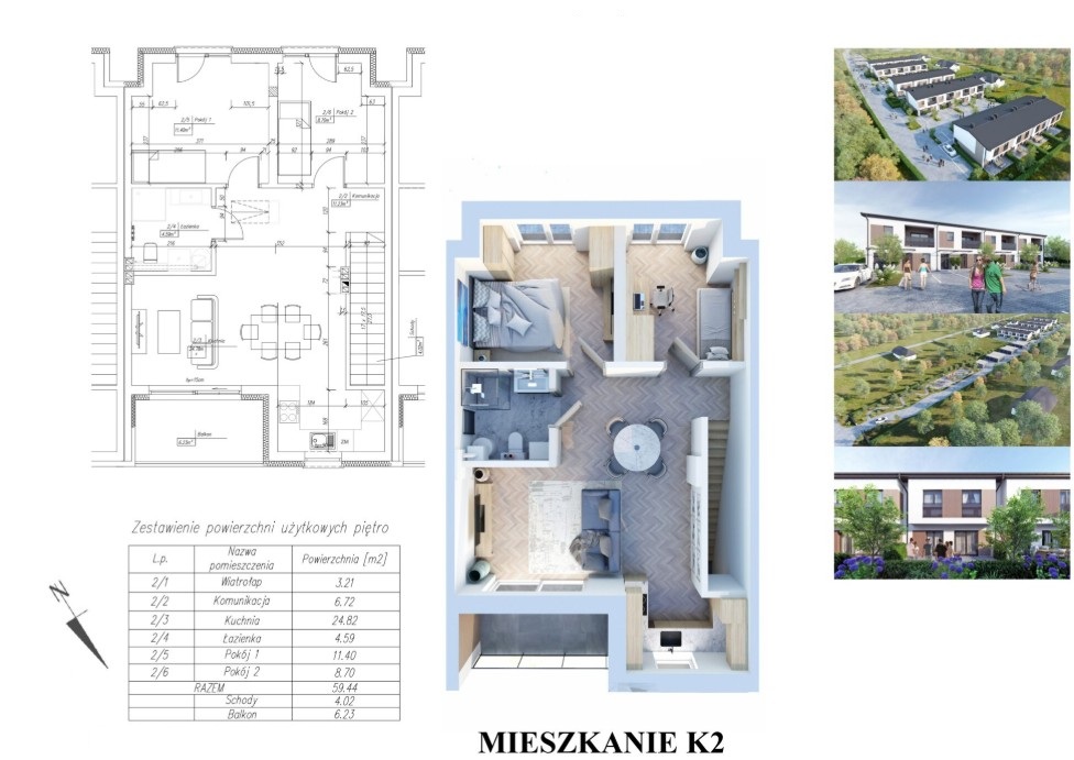 Osiedle oferuje funkcjonalne, 3-pokojowe mieszkania zaprojektowane z myślą o komforcie i niskich kosztach utrzymania. Lokale na parterze posiadają ogródki, natomiast mieszkania na piętrze – loggie. Do każdego mieszkania przypisane jest miejsce postojowe w cenie.