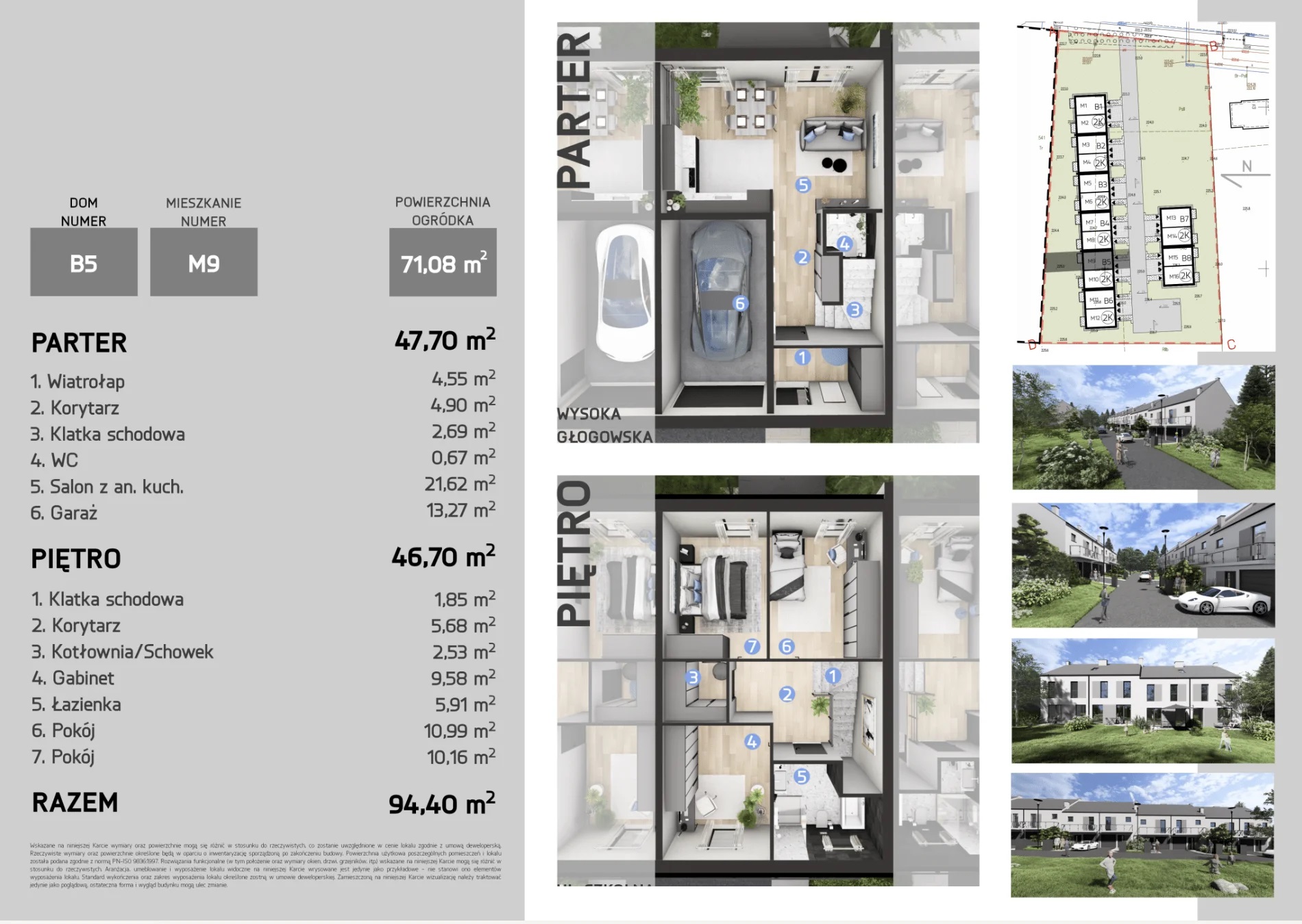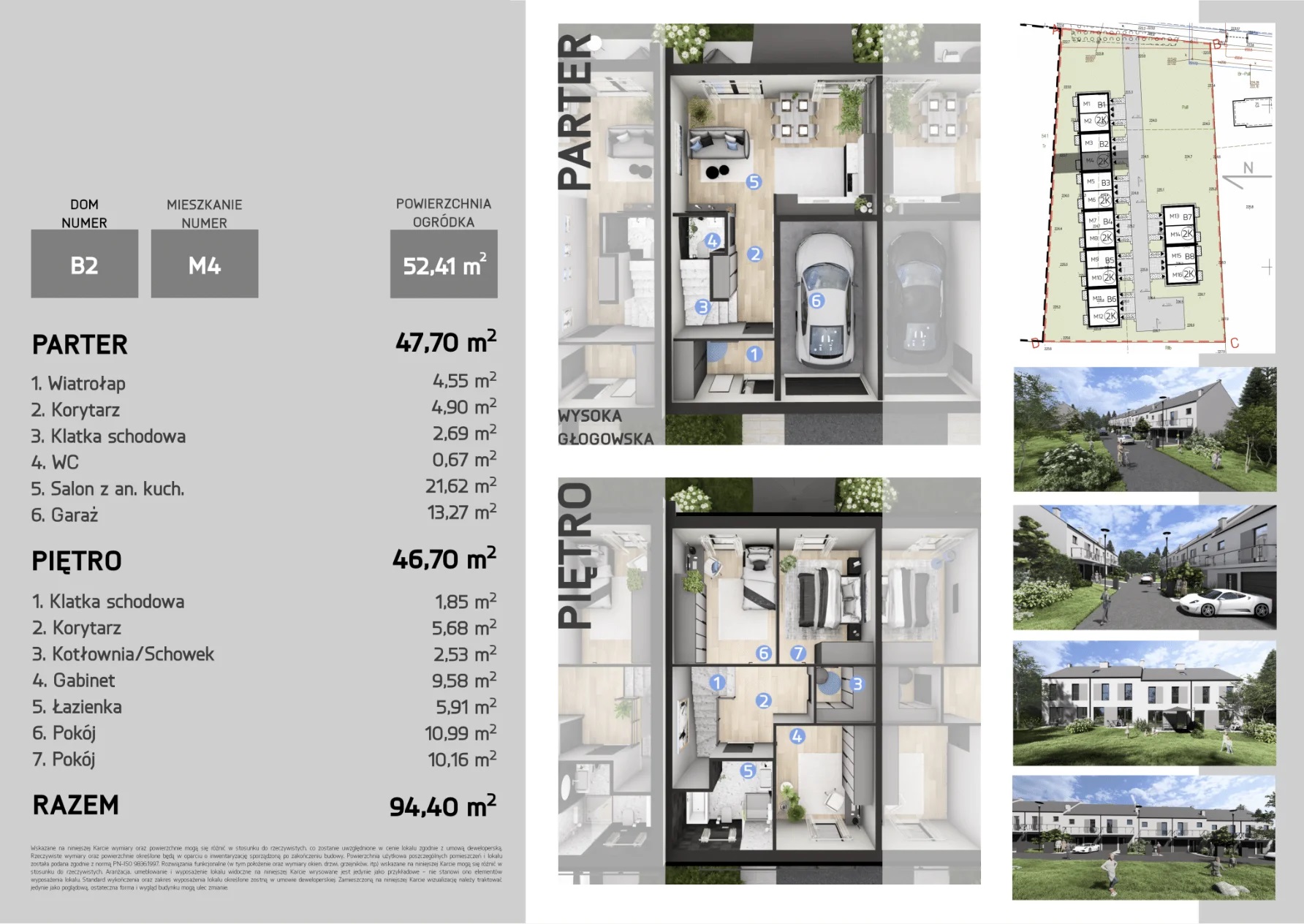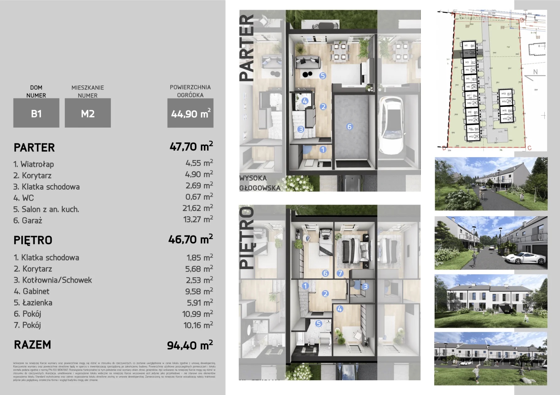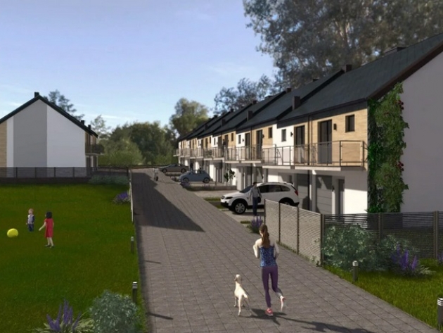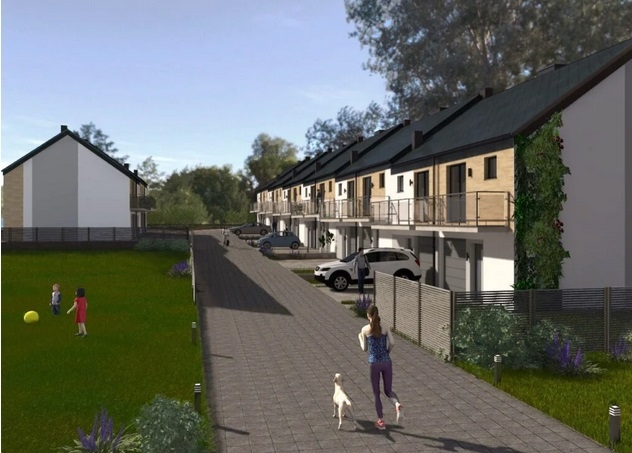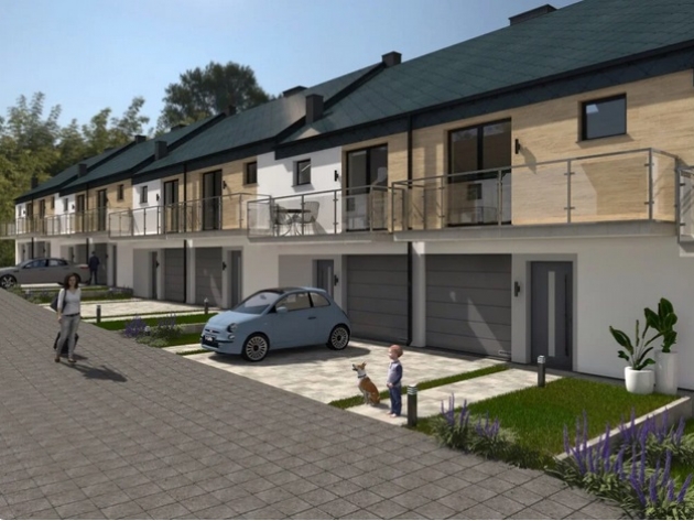 Każdy dom o powierzchni 94,4 m² z garażem oferuje przestronny salon z kuchnią oraz trzy pokoje na piętrze. Wysokiej jakości materiały, duże przeszklenia zapewniają wygodę i energooszczędność.