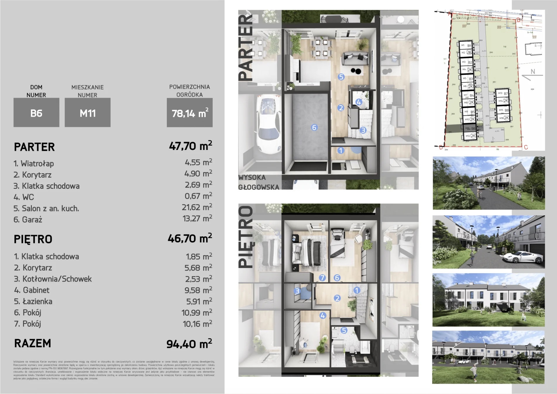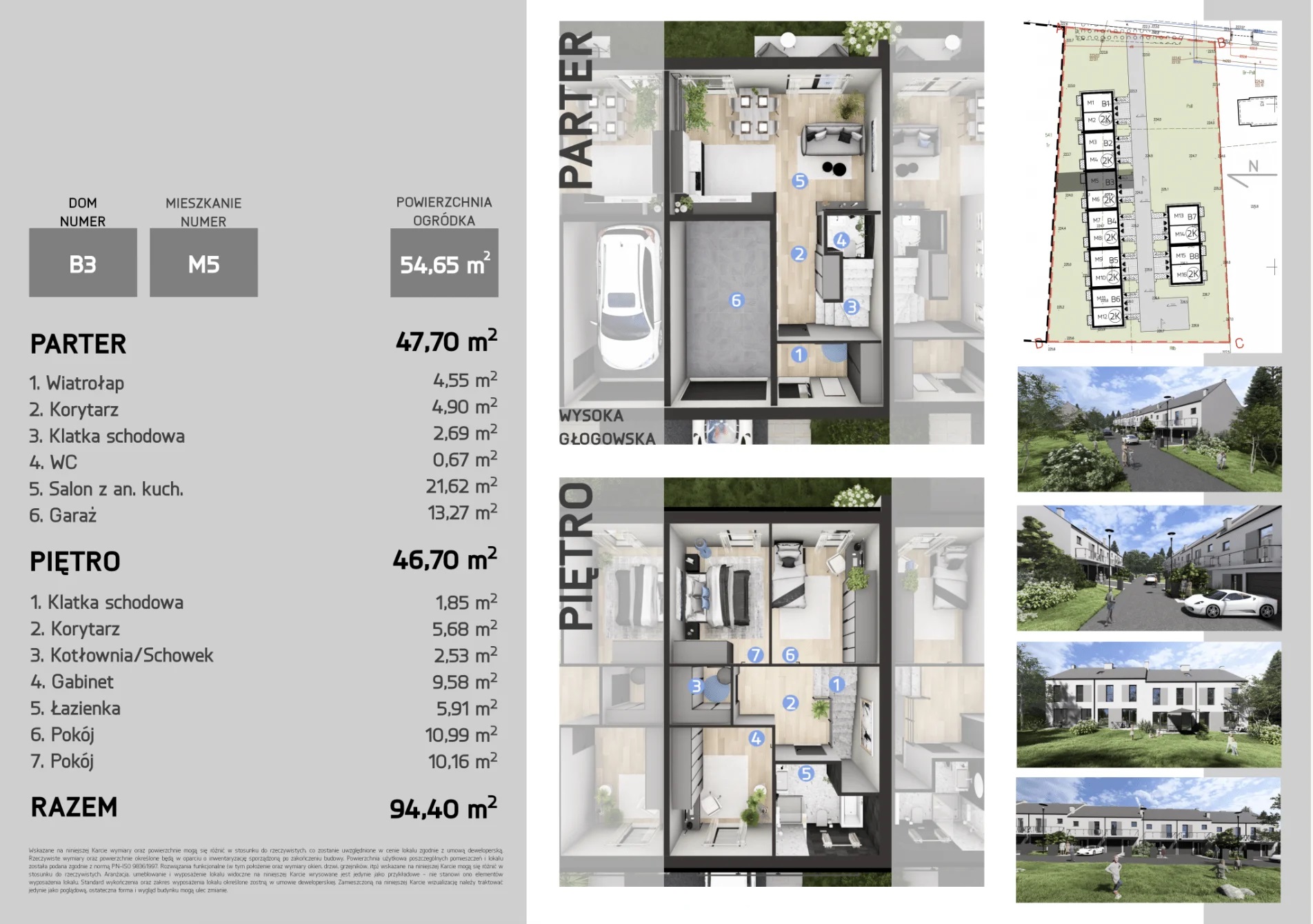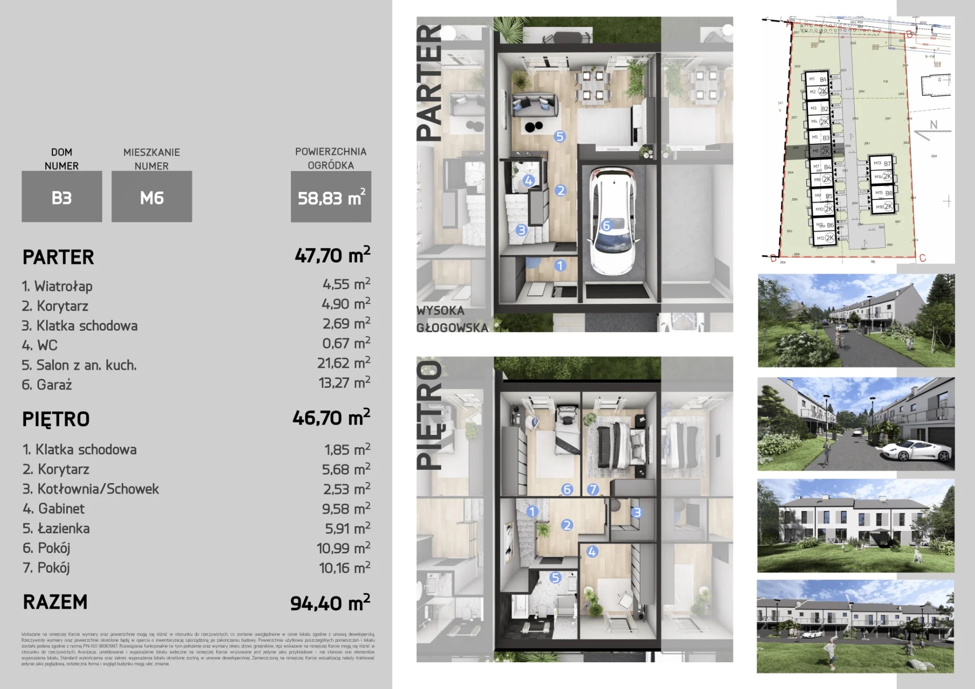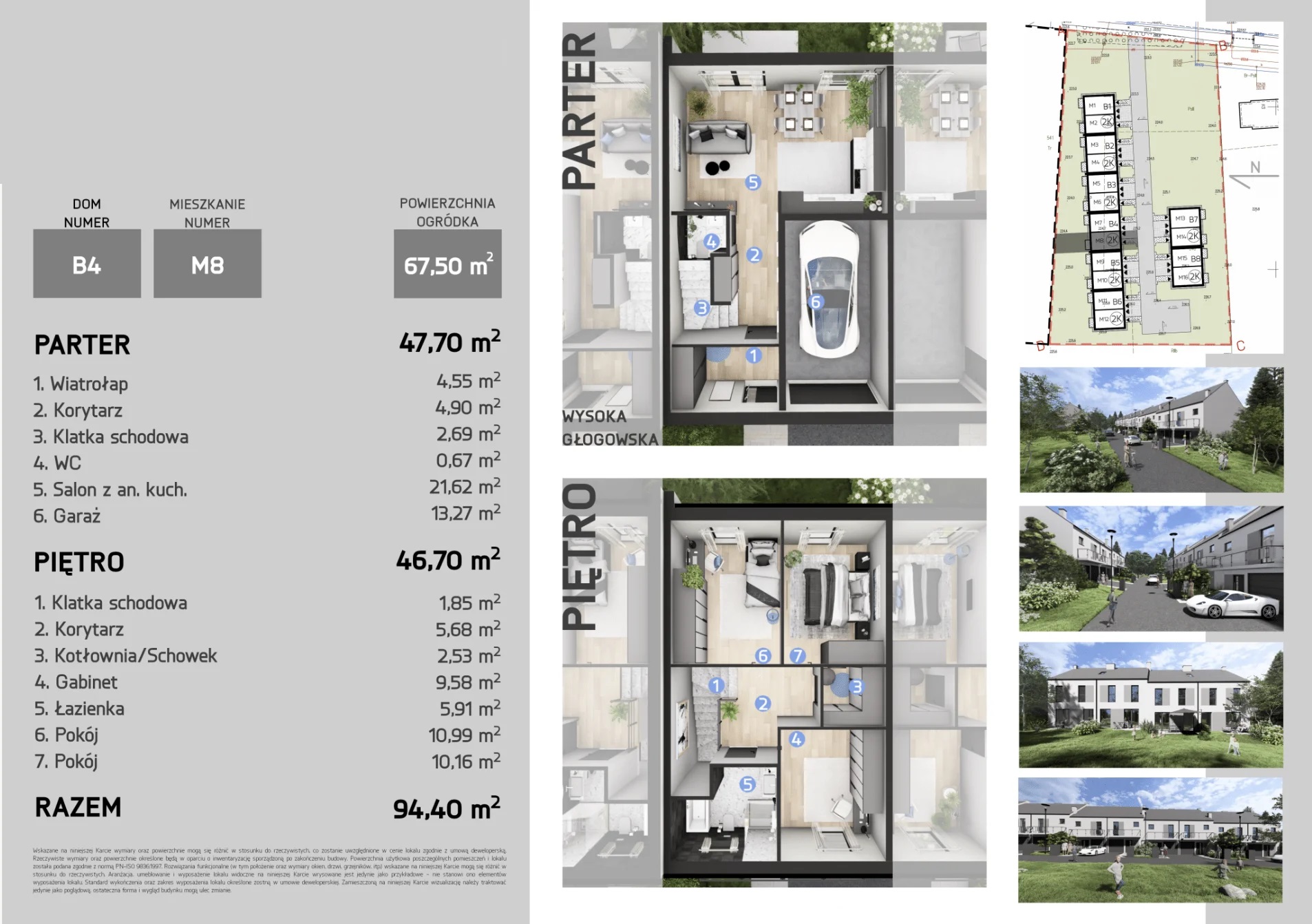 Każdy dom o powierzchni 94,4 m² z garażem oferuje przestronny salon z kuchnią oraz trzy pokoje na piętrze. Wysokiej jakości materiały, duże przeszklenia zapewniają wygodę i energooszczędność.