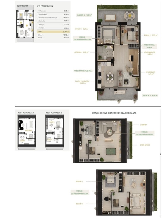• Piętro: 66,99 m² + poddasze użytkowe 40,91 m²